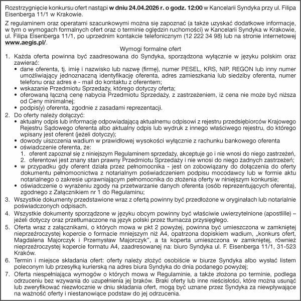 Z regulaminem oraz operatami szacunkowymi można się zapoznać (a także uzyskać dodatkowe informacje, w tym o wymogach formalnych ofert oraz o terminie oględzin ruchomości) w Kancelarii Syndyka w Krakowie, ul. Filipa Eisenberga 11/1, po uprzednim kontakcie telefonicznym (12 222 34 98) lub na stronie internetowej www.aegis.pl/.